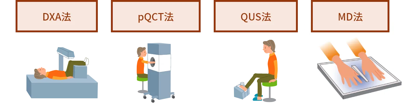 骨密度を測定する方法にはDXA法、pQCT法、QUS法(超音波法)、MD法とさまざまな種類があります。