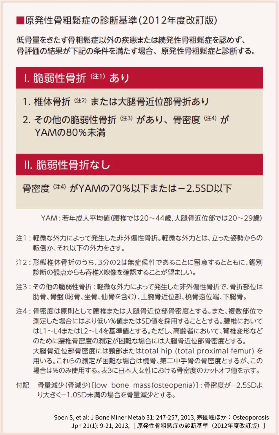 「原発性骨粗鬆症の診断基準(2012年度改訂版)」(日本骨代謝学会、日本骨粗鬆症学会合同による原発性骨粗鬆症診断基準改訂検討委員会)によると、原発性骨粗鬆症は、脆弱性骨折の有無と骨密度により診断します。