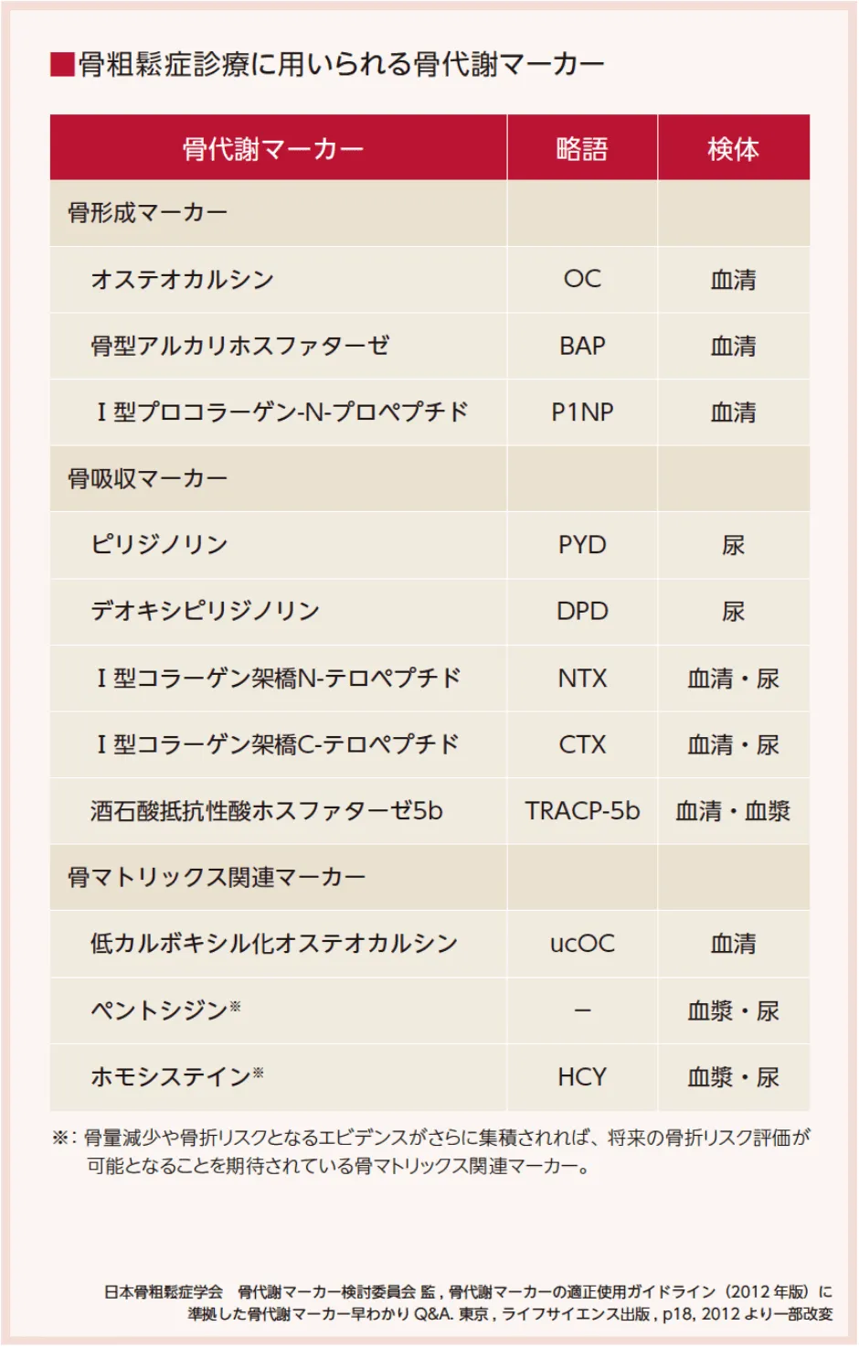 骨の新陳代謝の過程で出現する物質を骨代謝マーカーといいます。骨代謝マーカーには、骨芽細胞に関与する「骨形成マーカー」、破骨細胞に関与する「骨吸収マーカー」、骨質に関与する「骨マトリックス関連マーカー」があり、血液や尿を用いて測定します。