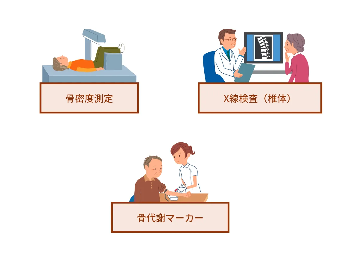 骨粗鬆症の検査には骨密度測定、X線検査、骨代謝マーカーの測定があります。