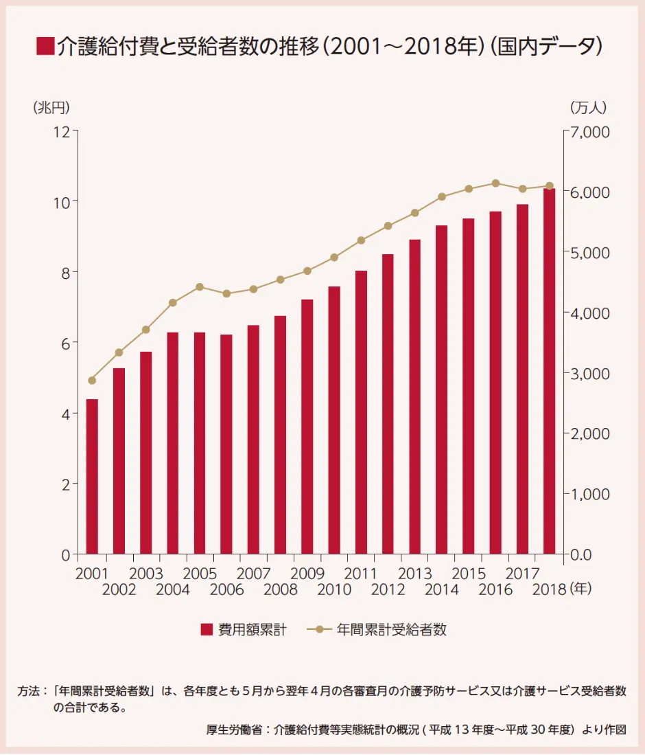 2015年以降、介護サービスを受けている人は6,000万人を超え、2018年時点での介護給付費は10兆円を超えています。