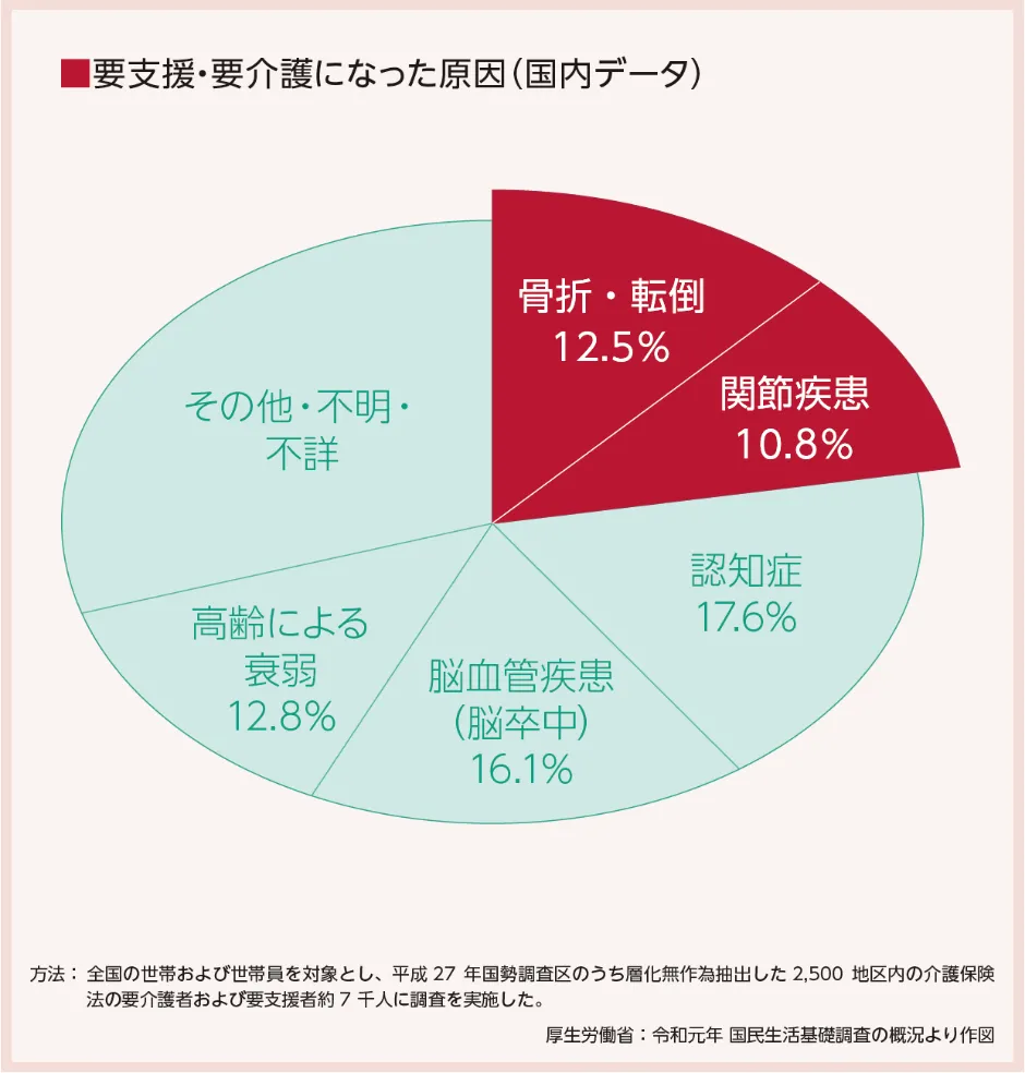 要支援・要介護となった5人に1人は、「骨折・転倒、関節疾患」が原因となっていることが示されています。