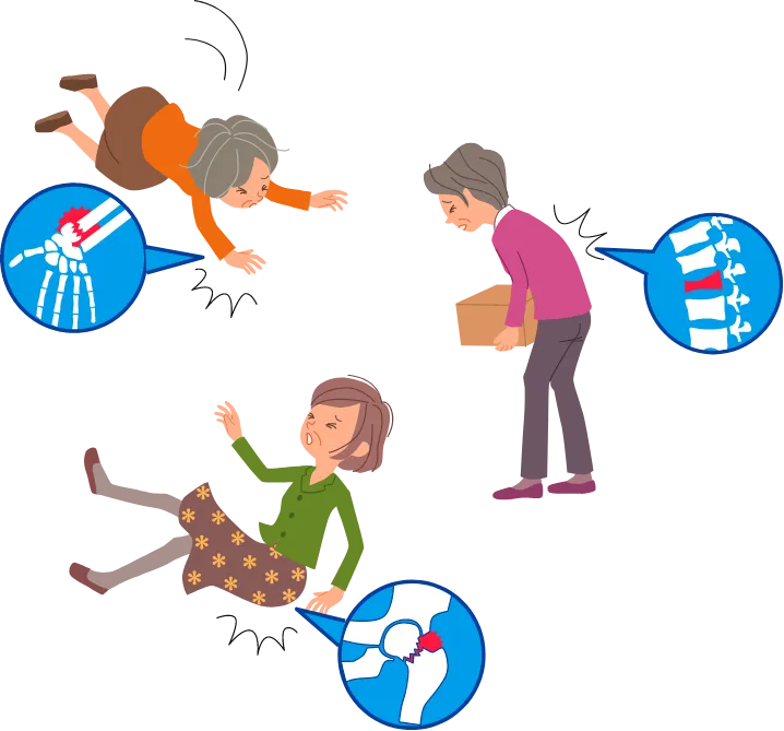 脆弱性骨折とは、骨量の減少や骨質の劣化によって骨強度が低下し、軽微な外力によって発生した非外傷性骨折です。