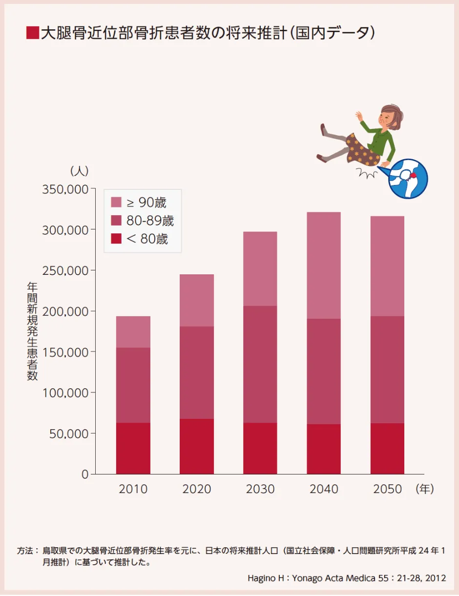 2012年に年間約19万人の大腿骨近位部骨折が発生し、2040年には年間約30万人に発生すると推計されています。