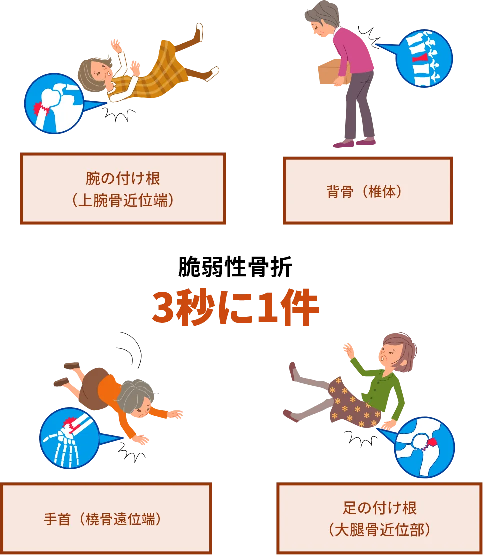世界では、脆弱性骨折は3秒に1件のペースで起こっているといわれています。