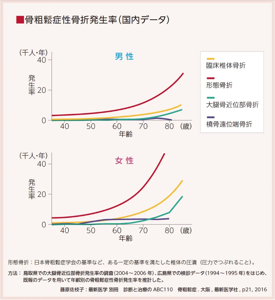 椎体骨折は60歳代から、大腿骨近位部骨折は70歳代後半から急激に増加します。
