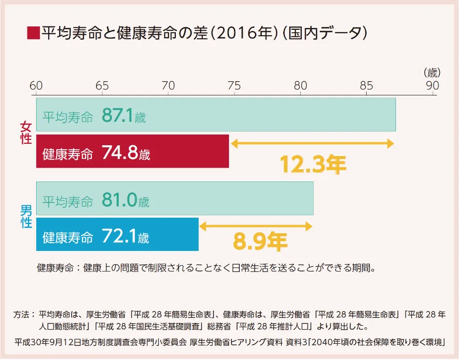 しかし、平均寿命と健康寿命の差は、男性で8.9年、女性で12.3年です。