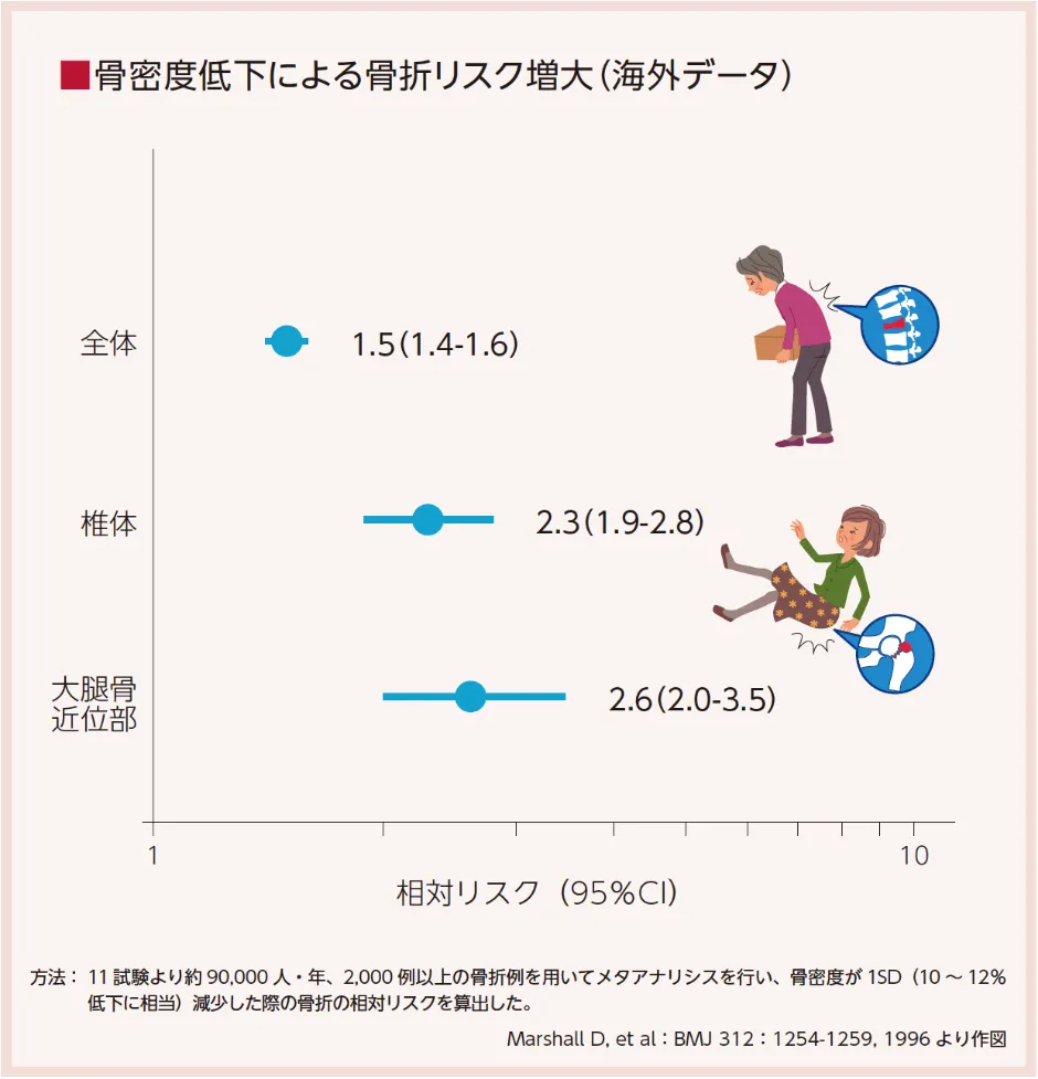 骨密度の低下が骨折リスクに影響を及ぼすことが報告されています。