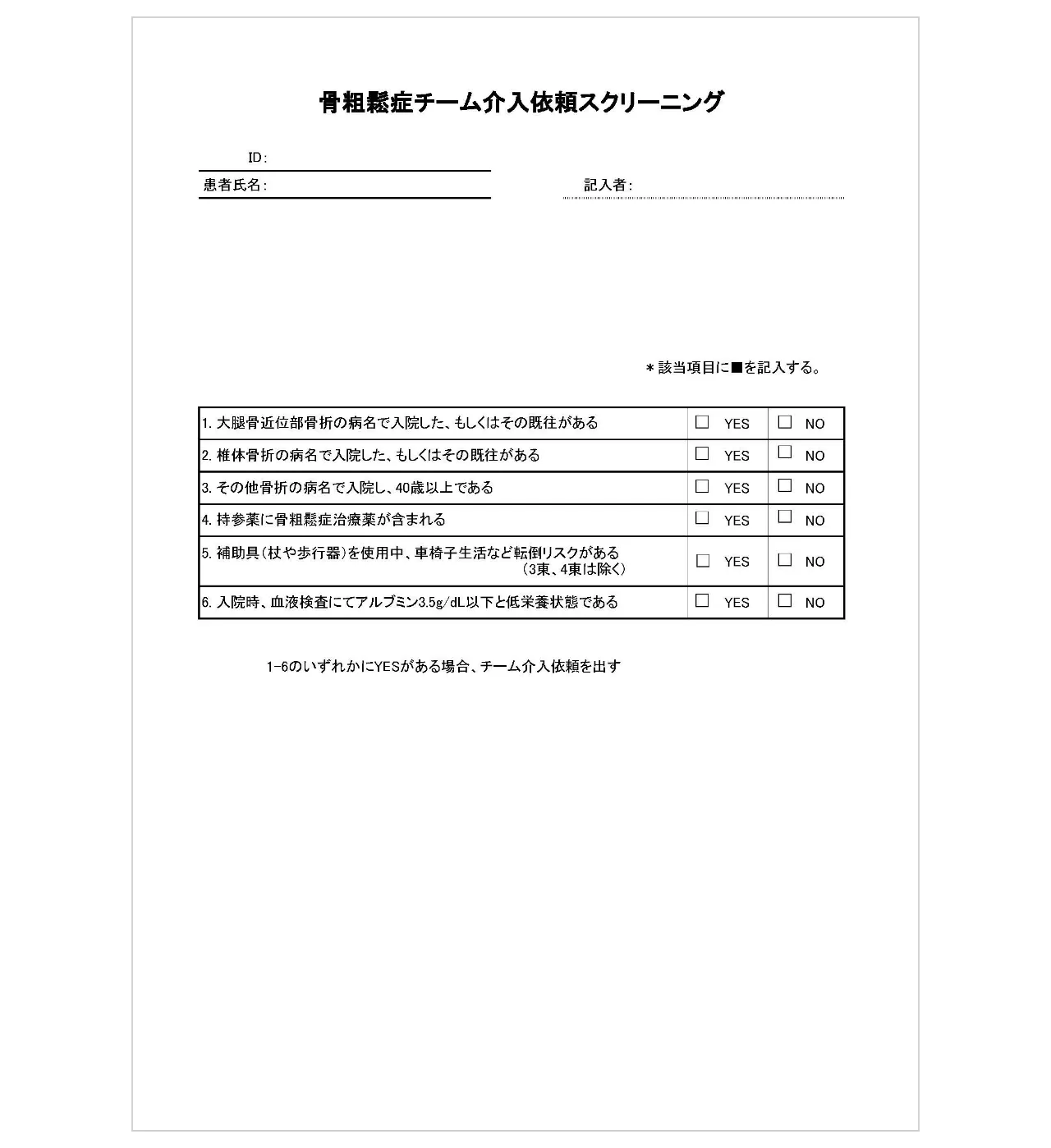 - 「骨粗鬆症チーム介入依頼スクリーニング」では以下を確認している。