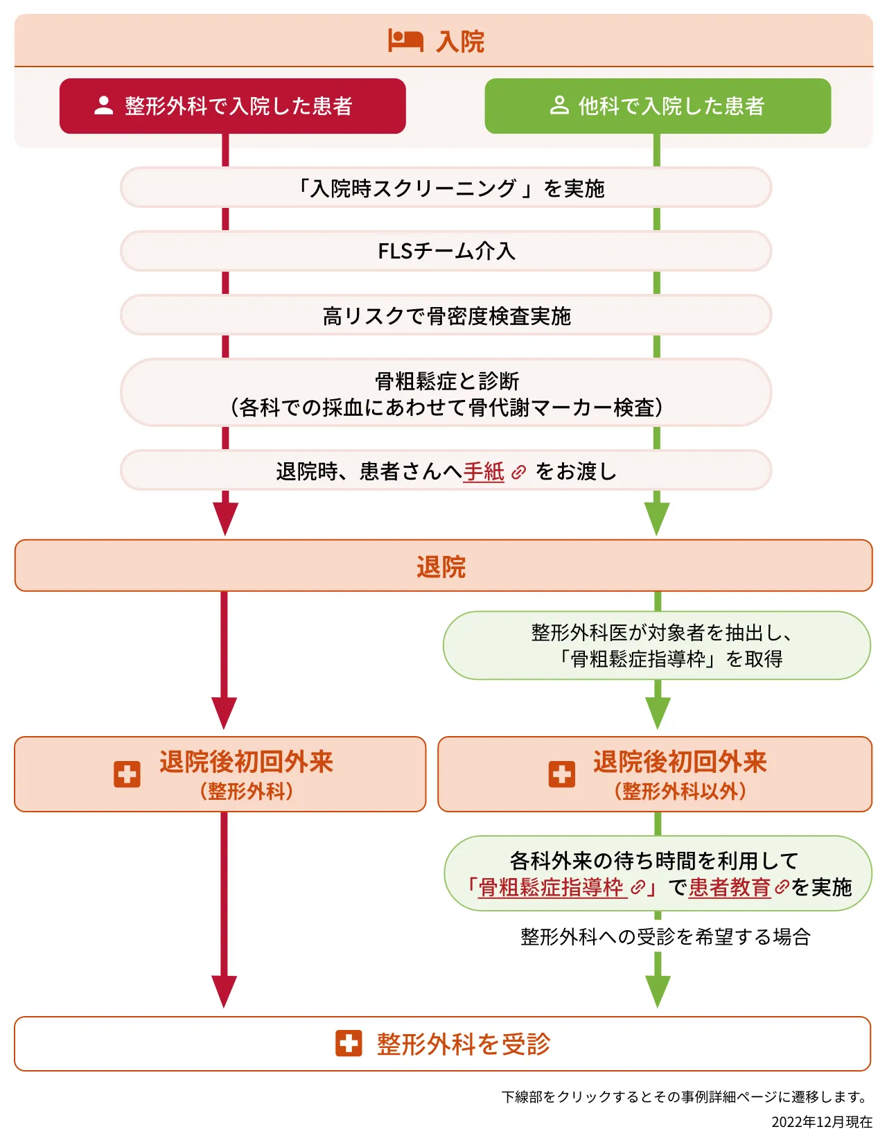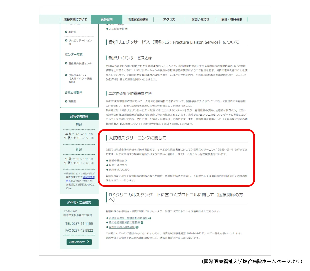 - 脆弱性骨折リスクが高い患者さんを他科を含めて拾い上げる目的で、すべての入院患者さんに対して看護師が「入院時スクリーニング」を実施