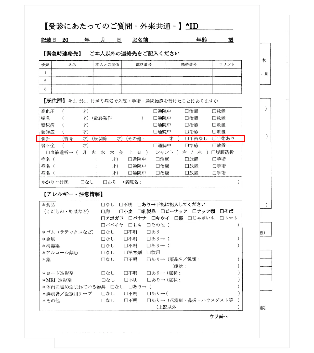 - 「脆弱性骨折以外の疾患で入院した脆弱性骨折の既往がある患者さん」に関しては、入院時に全科の患者さんに記入してもらっている問診票の中に、脆弱性骨折の既往歴(椎体骨折、大腿骨近位部骨折、その他骨折)の項目を設けて確認している。
