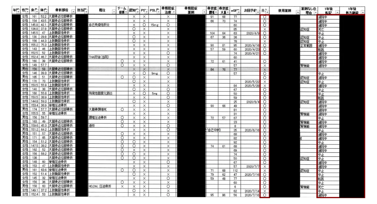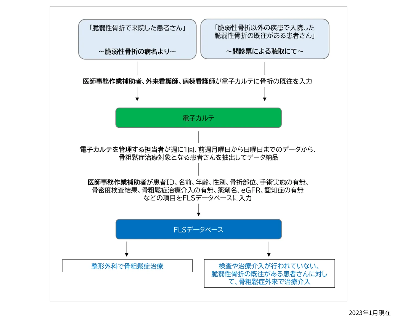 - 納品された抽出データから医師事務作業補助者が患者ID、名前、年齢、性別、骨折部位、手術実施の有無、骨密度検査結果、骨粗鬆症治療介入の有無、骨粗鬆症治療薬剤名、eGFR、認知症の有無などの項目をFLSデータベースに入力する。