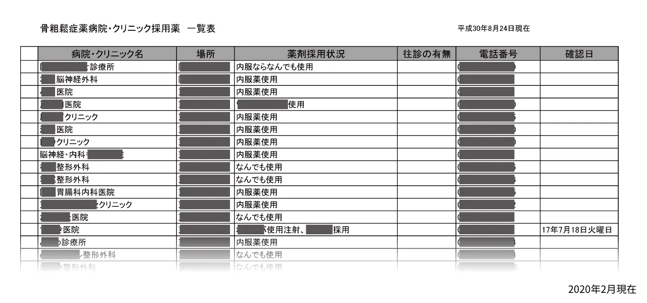 - かかりつけ医における骨粗鬆症治療薬の採用状況をリスト化し、院内で情報共有している。処方薬剤が決定した際、退院後通院予定のかかりつけ医に処方が可能かどうかを担当相談員が電話で確認し、併せてそのほかの採用薬剤についても聴取しリストをアップデートしている。リスト収載当時は内服薬のみの採用であっても、後に注射薬への対応を開始している可能性があるため、適宜電話で確認して情報を更新している。