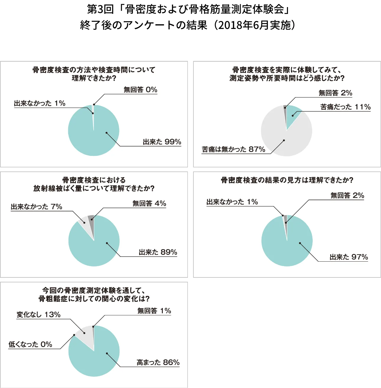 - 骨密度検査を体験してもらうことで、「他人ごと」だった骨粗鬆症が「自分ごと」へと関心の高まりが変化し、より知識が定着しやすくなるように感じられた。