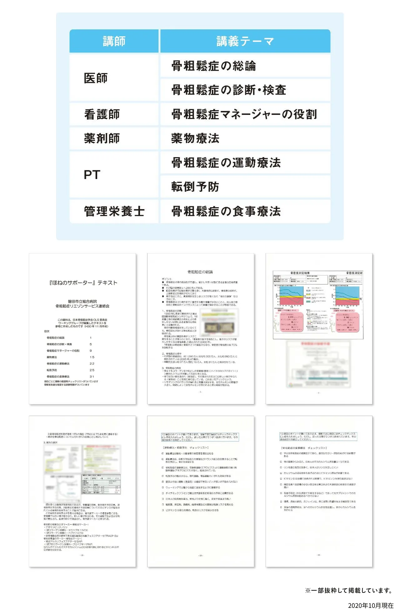 3カ月間に42回程度、医師と看護師、薬剤師、PTおよび管理栄養士が講師となり、看護外来を担当する看護師を育成するための「ほねのサポーター」認定研修を実施し、骨粗鬆症治療の知識構築に役立てています。