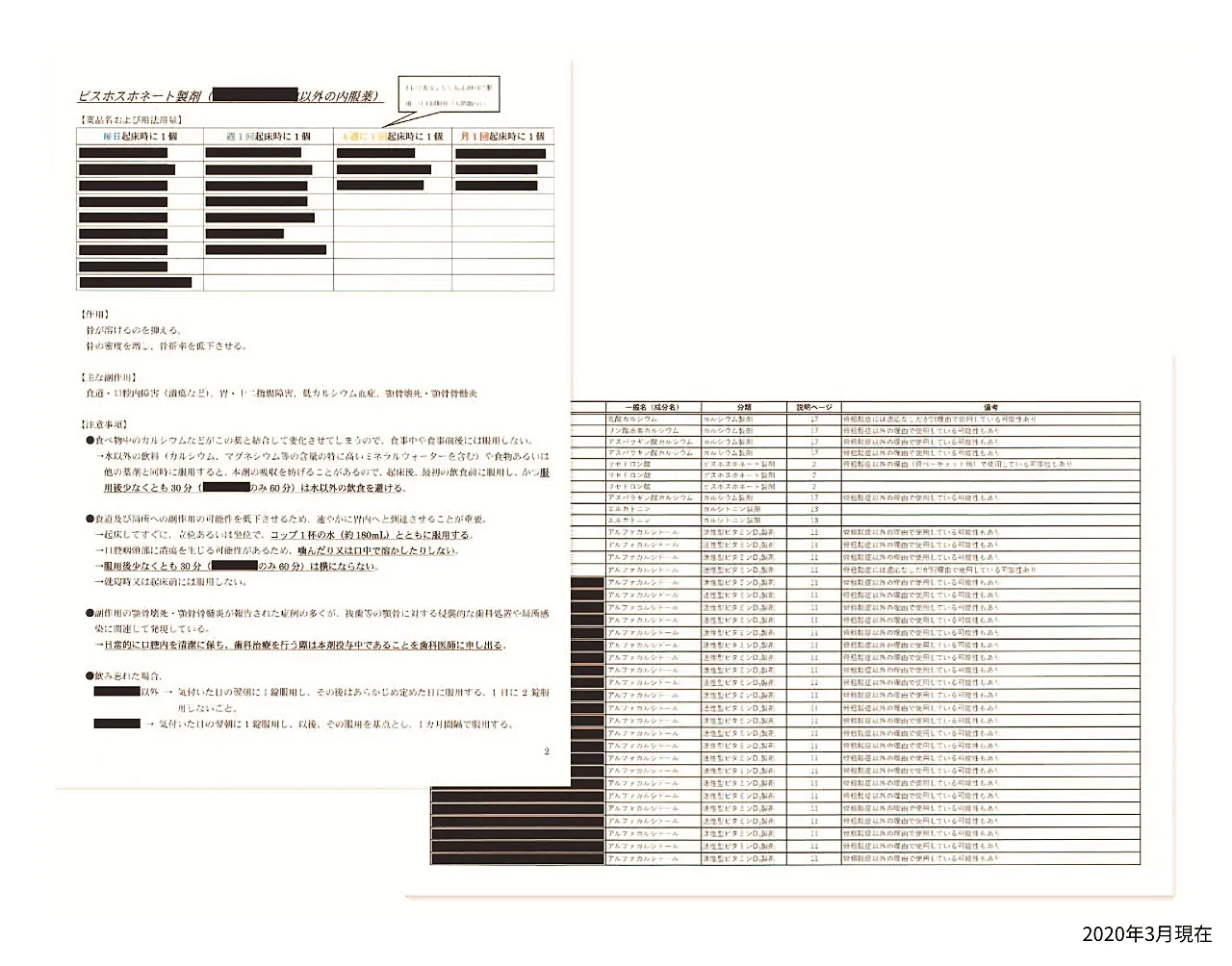 - 一覧とセットとして、カルシウム製剤やビスフォスフォネート製剤など、薬効分類ごとに作用や主な副作用、服用時の注意事項をまとめた説明資料を用意し活用