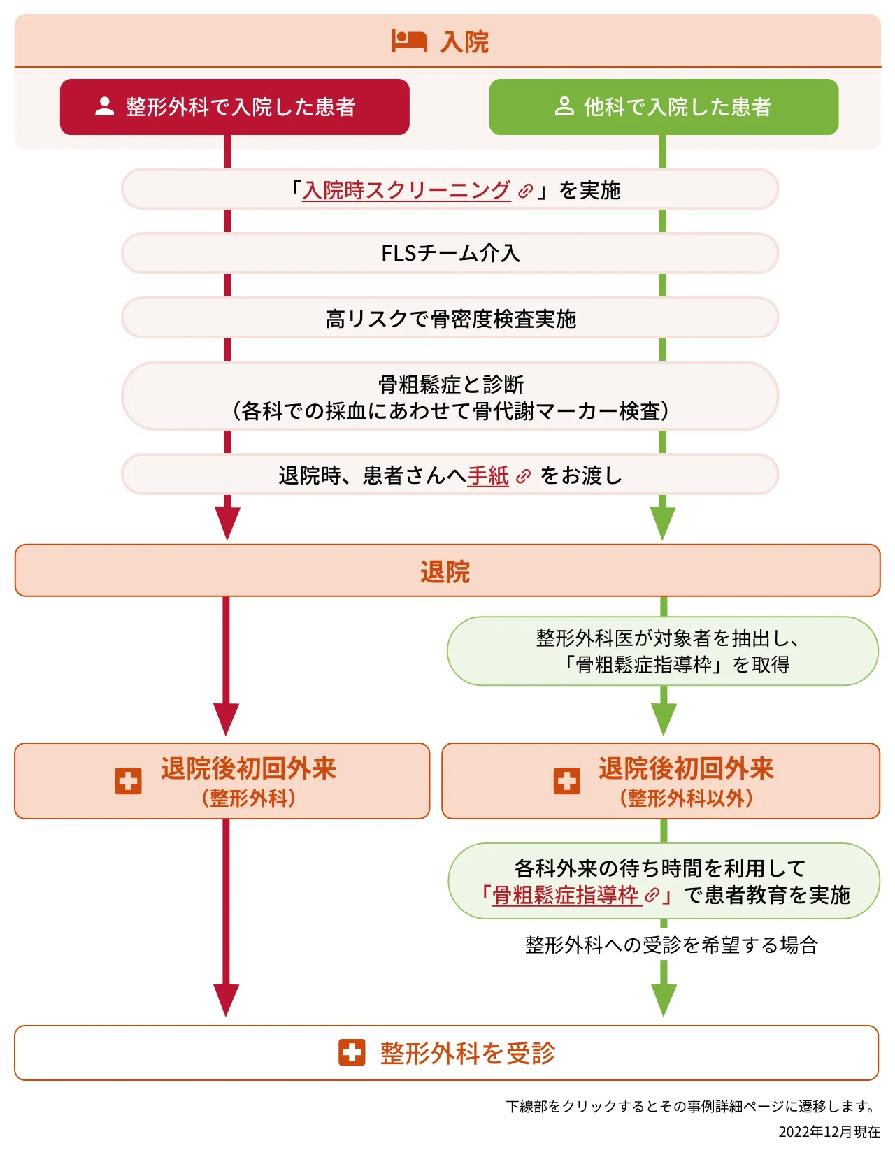- 同施設では、退院後初回外来の待ち時間を活用し、FLS対象患者さんを含め入院中に骨粗鬆症の診断がついた患者さんを対象に「骨粗鬆症指導枠」という指導の時間を設けて、骨粗鬆症マネージャーを中心としたリハビリスタッフが患者教育を行っている。