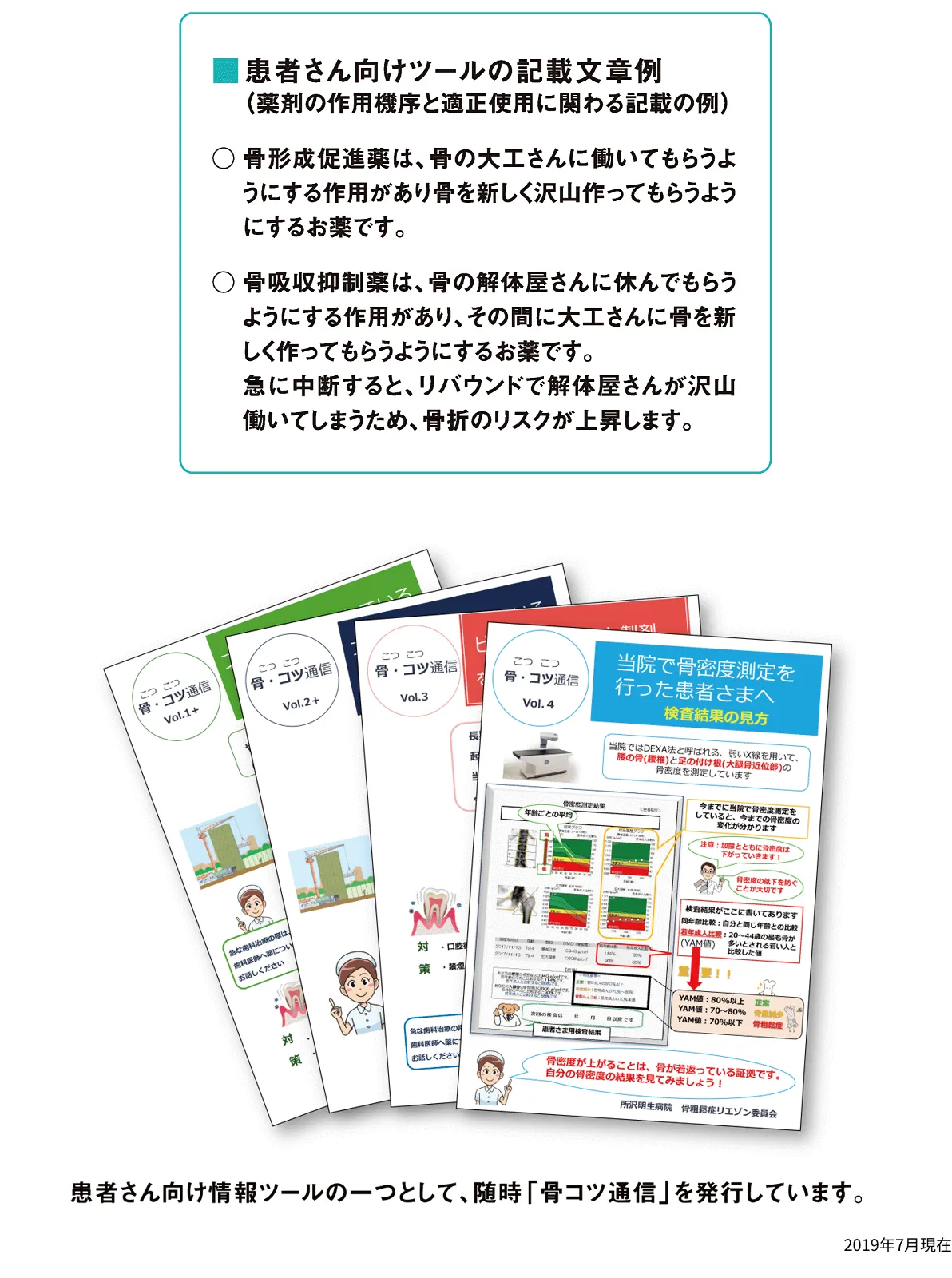 外来時や入院中にFLSメンバーが、骨粗鬆症治療に関する情報が記載された患者さん向け情報ツールを用いて説明し、正しい情報を漏れなく伝えています。