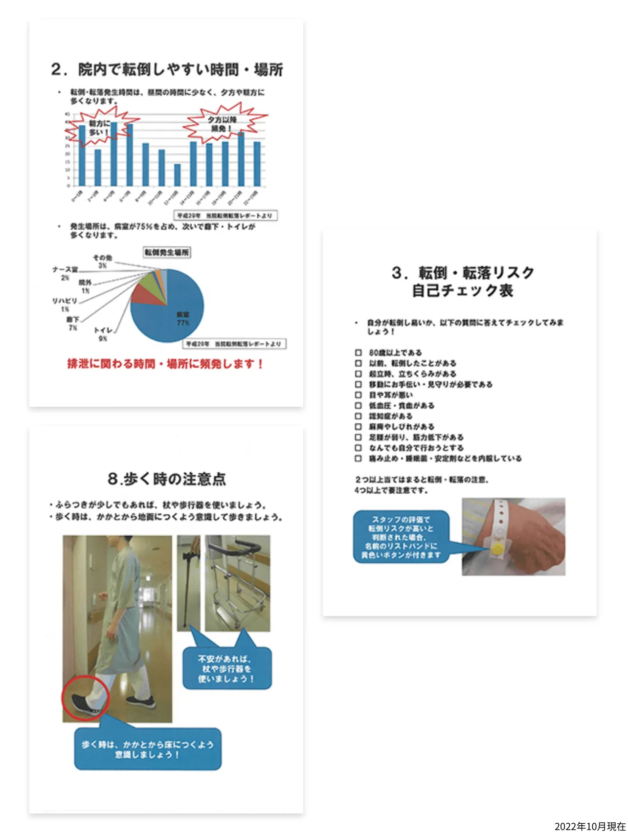- 本パンフレットには、転倒・転落の危険性や院内で転倒しやすい時間・場所といった患者さんに前提として知っておいていただきたい情報をはじめ、ご自身の転倒・転落リスクを確認する自己チェック表や、ベッド周り・車椅子・トイレでの注意点などの患者さんの状態や状況、運動能力に応じて指導できる情報も掲載している。