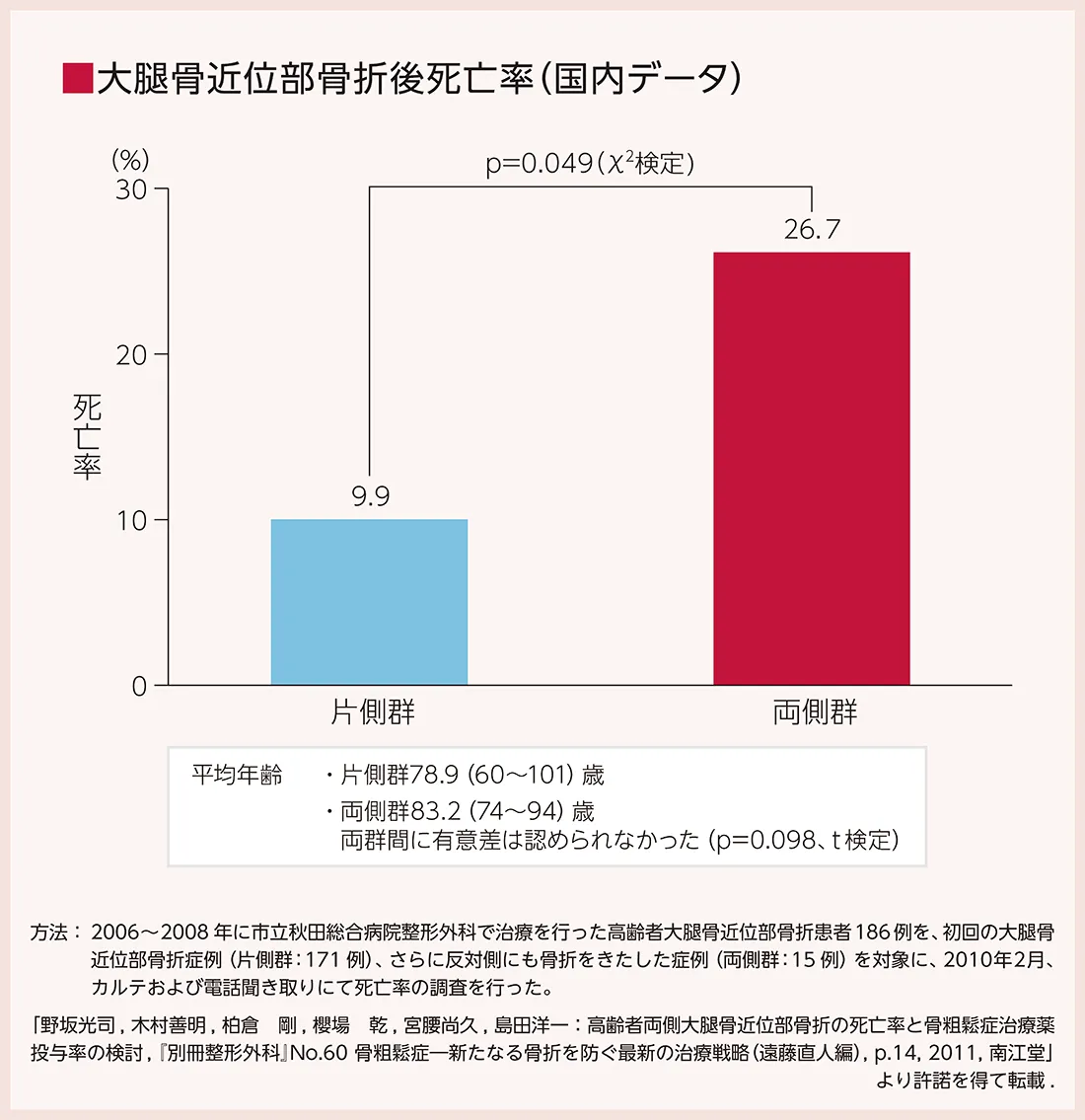 2006年~2008年に大腿骨近位部骨折の治療を行った患者さんを2010年に調査したところ、片側のみの骨折例の死亡率は9.9%でした。