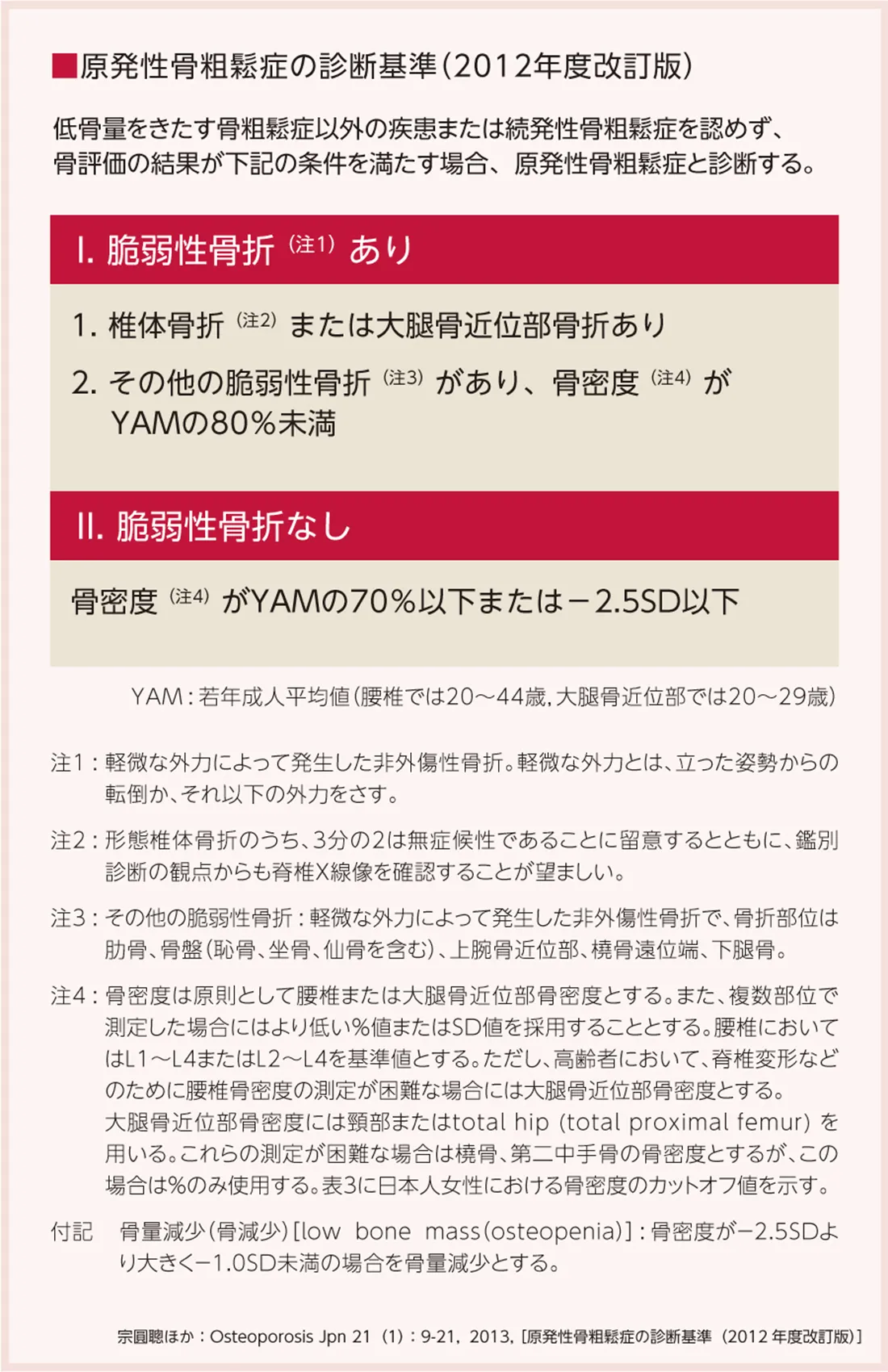 Soen S, et al: J Bone Miner Metab 31: 247-257, 2013, 宗圓聰ほか: Osteoporosis Jpn 21(1): 9-21, 2013, [原発性骨粗鬆症の診断基準(2012年度改訂版)]