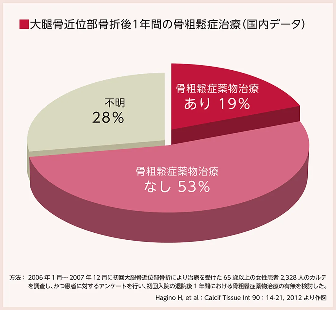 しかし、大腿骨近位部骨折後1年間に骨粗鬆症の薬物治療を行っていたのは、約20%との報告があります。