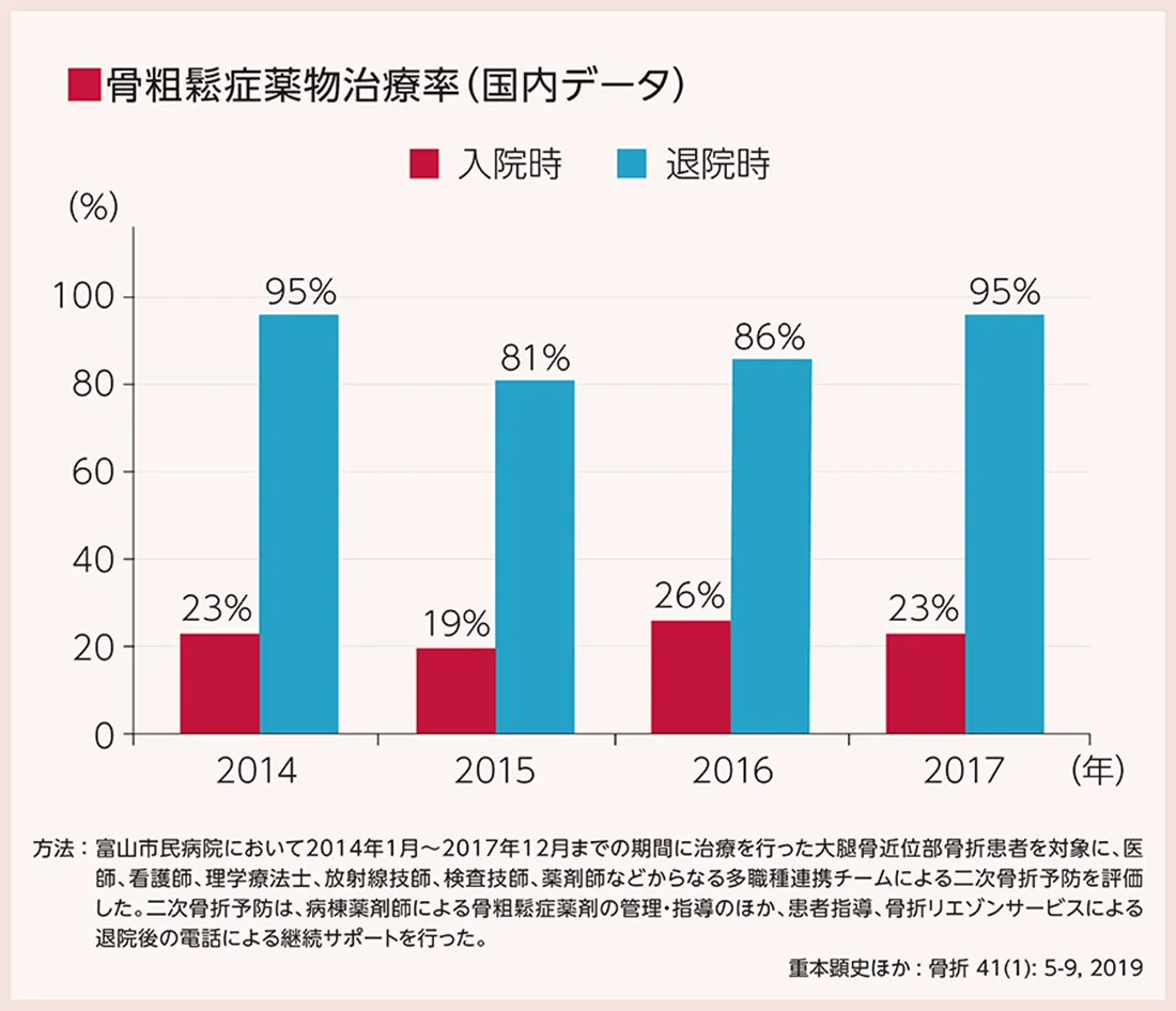 富山市民病院で大腿骨近位部骨折患者を対象に、多職種連携チームによる二次性骨折予防を評価したところ、入院時の骨粗鬆症の治療率は平均23%でしたが、退院時では平均89%と、高い治療率でした。