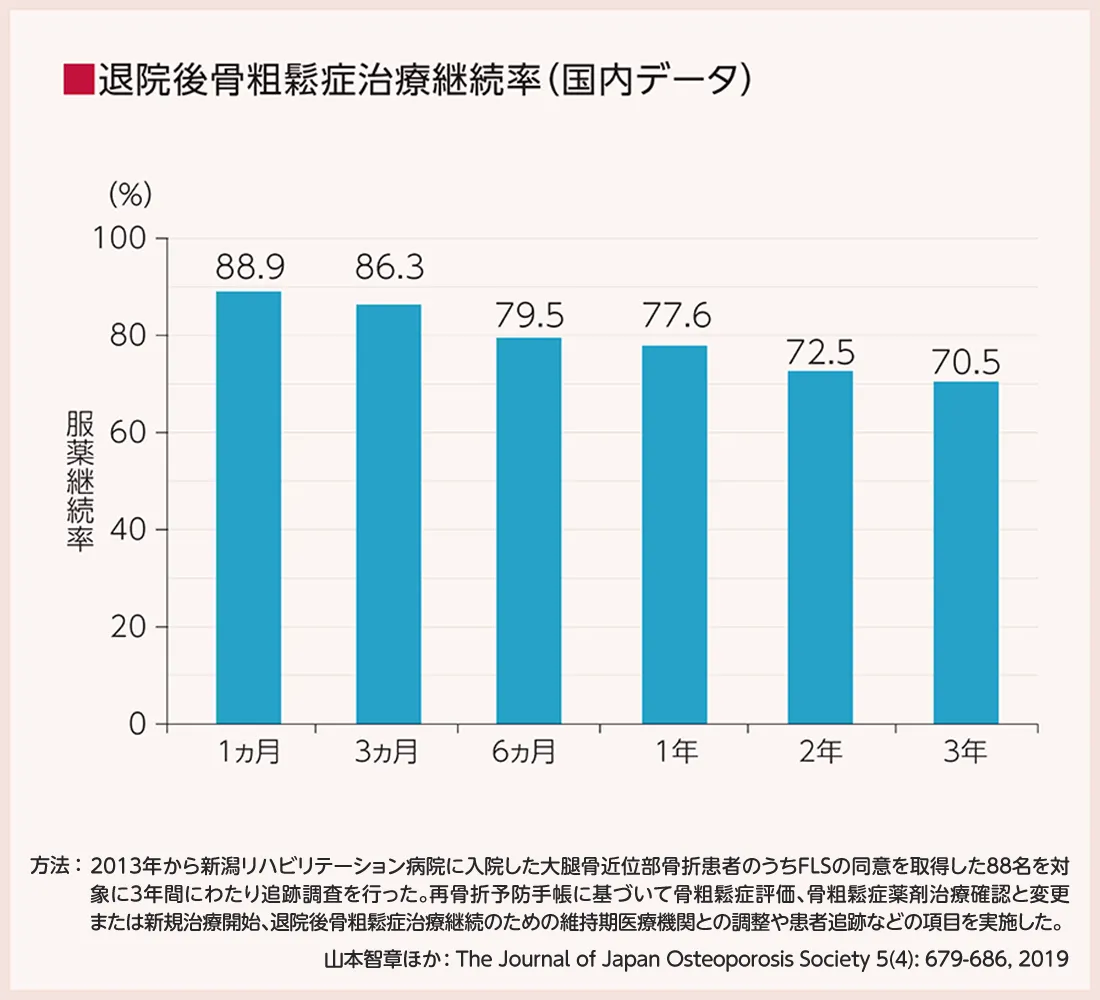 新潟リハビリテーション病院に入院した大腿骨近位部骨折の患者さんのうち、FLSの同意を取得した88名を対象に3年間にわたり追跡調査を行ったところ、骨粗鬆症の治療継続率は70%以上と、高い継続性が得られました。