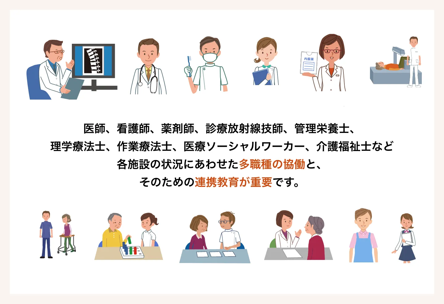 また、FLSの取り組みを行うチームメンバーとして、医師、看護師、薬剤師、診療放射線技師、管理栄養士、理学療法士、作業療法士、医療ソーシャルワーカー、介護福祉士などが挙げられますが、どのような職種でチームを編成するかは、各施設の状況にあわせて決定することが重要であり、そのための連携教育も重要であると考えられています。