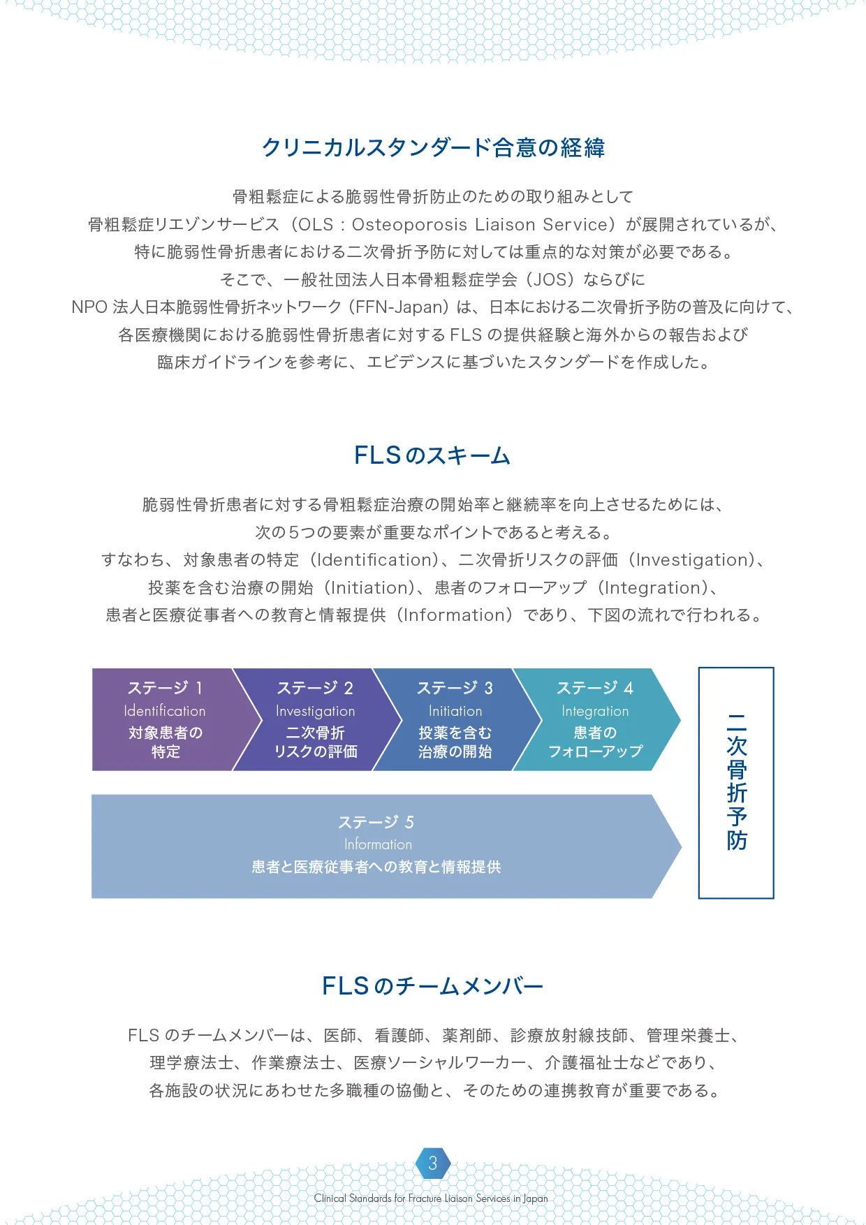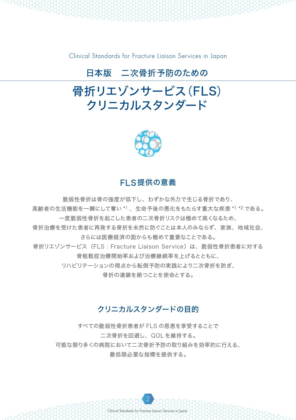 「骨折リエゾンサービス(FLS)クリニカルスタンダード」とは、FLSを実施するすべての施設が二次性骨折予防の取り組みを効率的に行うために示された、最低限必要な指標です。