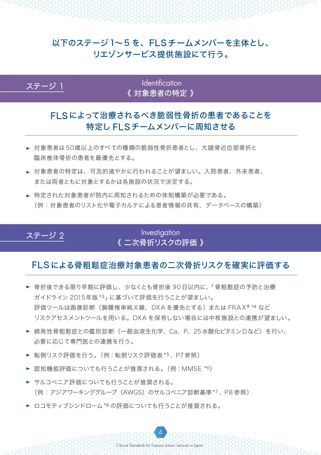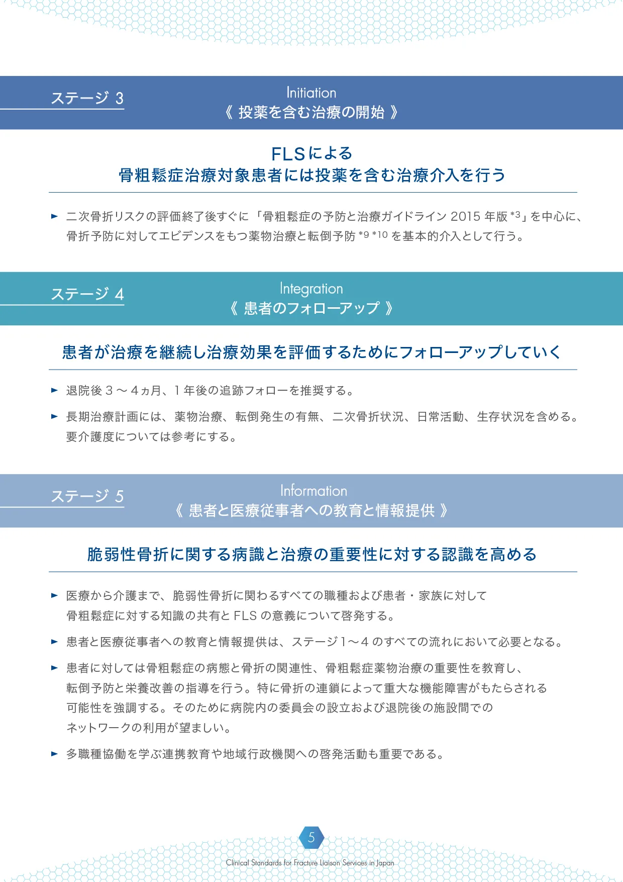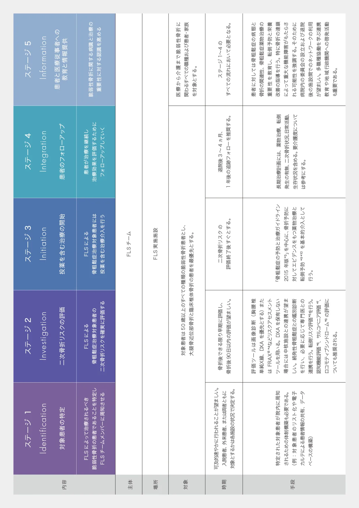 1~5の各ステージにおいては、FLSクリニカルスタンダードの「可能な限り多くの病院において二次性骨折予防の取り組みを効率的に行える、最低限必要な指標を提供する」という目的の観点から、ステージごとに「実施を必須とする項目」「実施が推奨される項目」として記載、提唱されています。