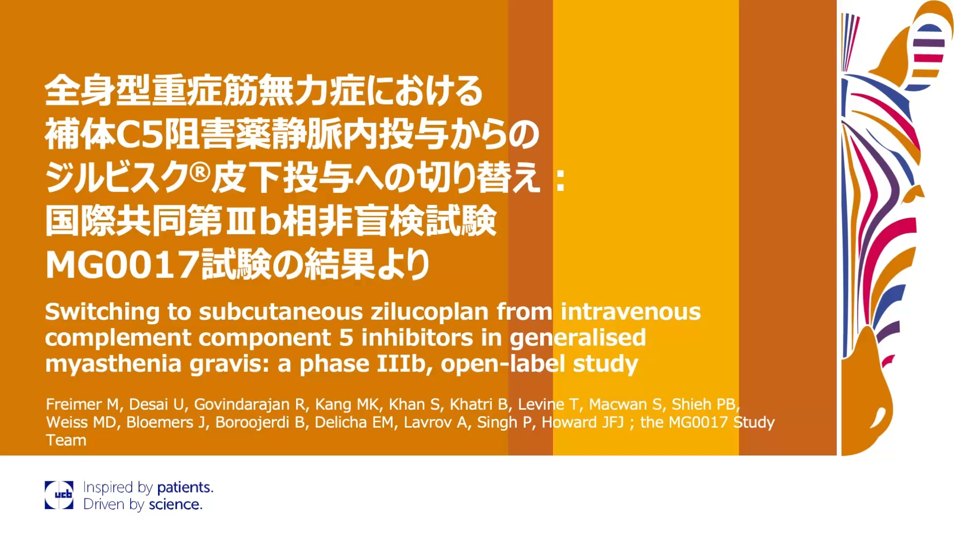 ジルビスク 動画 全身型重症筋無力症に対するジルビスク® (ジルコプラン) の作用機序 検索結果に戻る 資料請求先 各資材をご希望の際には、ユーシービージャパン株式会社担当MRもしくは、ユーシービーケアーズ コンタクトセンターにご連絡ください。 ユーシービーケアーズ コンタクトセンター 0120–093-189 受付時間:9:00~17:30(土日・祝日・会社休日を除く) Webからの請求はこちらから 患者さん指導用ツール検索はこちら ※本サイトに掲載されている内容や監修・出演の医療関係者の皆様のご所属などは制作当時のものとなります。現在と異なる場合もございますが、ご了承ください。