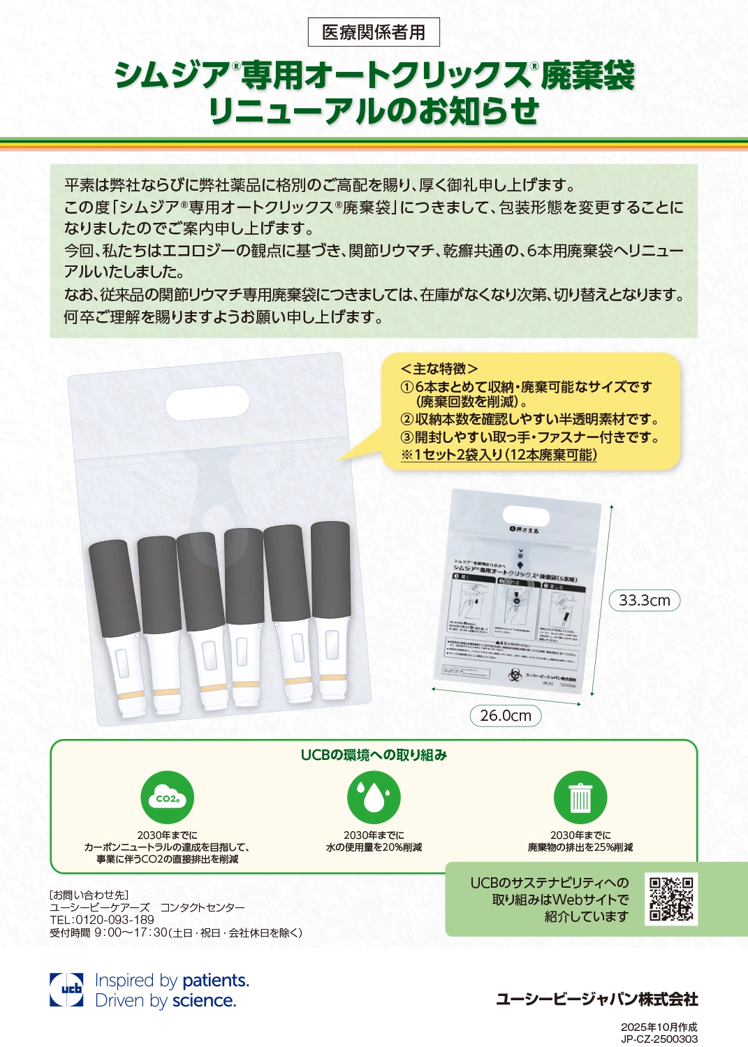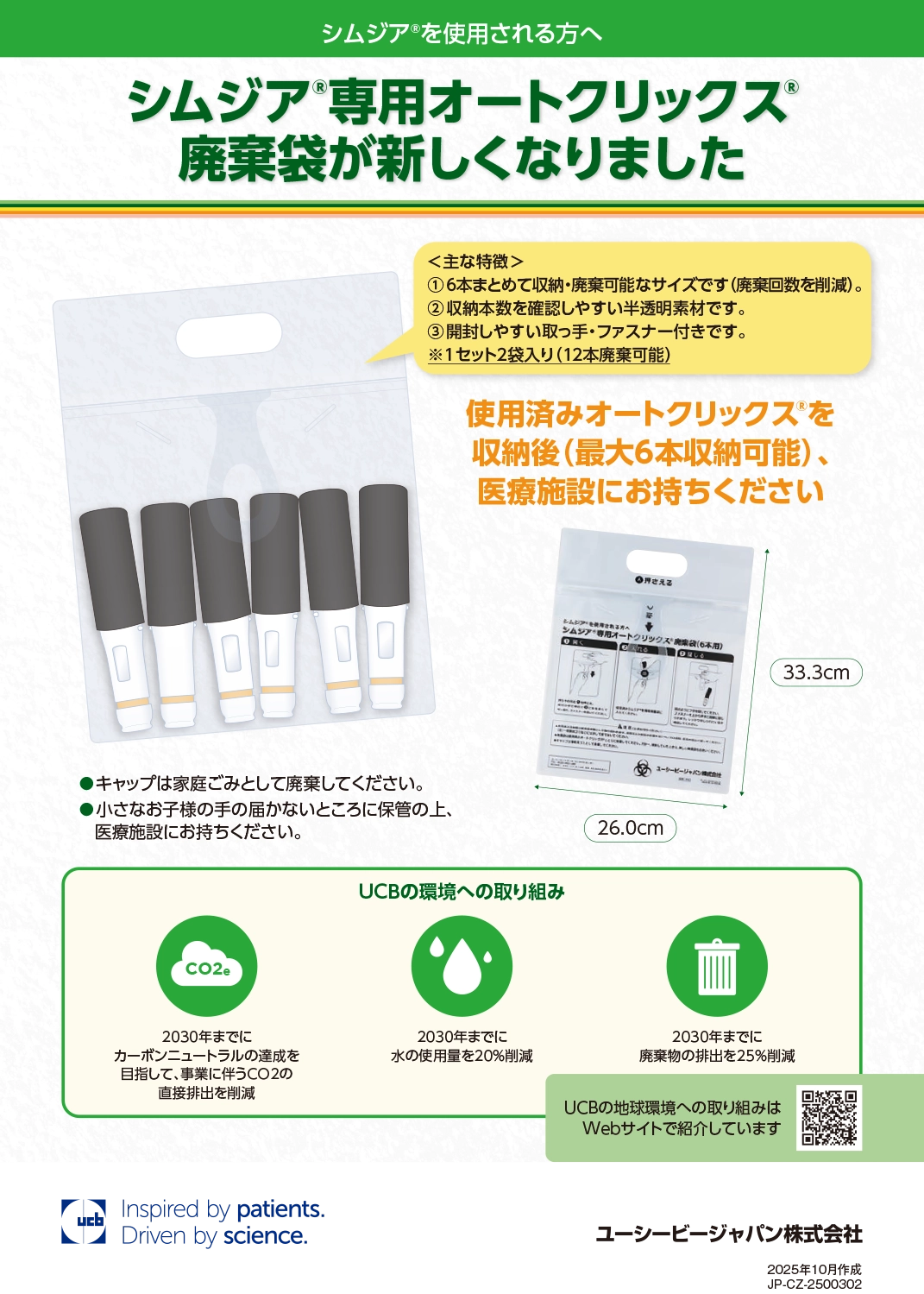 シムジアⓇトップ 関節リウマチ 乾癬 画像 シムジアⓇ関節リウマチトップ シムジアⓇについて 適正使用情報 自己注射について Webセミナー情報 医療関係者向け資材 患者さん向け資材 製品基本情報 セミナー情報 患者さん指導用ツール 製品基本情報 シムジア®皮下注200mgオートクリックス® シムジア®皮下注200mgシリンジ 患者さん指導用ツール シムジア 関節リウマチ 資材 シムジア専用オートクリックス廃棄袋 患者さん用案内文書 シムジア 関節リウマチ 資材 シムジア専用オートクリックス廃棄袋 医療関係者用案内文書 シムジア 資材 シムジアによる乾癬治療を受けられる方へ( A5 / 22ページ) 医療ナレッジ シムジア 関節リウマチ 資材 シムジア®適正使用ガイド 関節リウマチ版 シムジア 乾癬 資材 シムジア適正使用ガイド乾癬版 シムジア 乾癬 資材 シムジア投与ガイド乾癬版